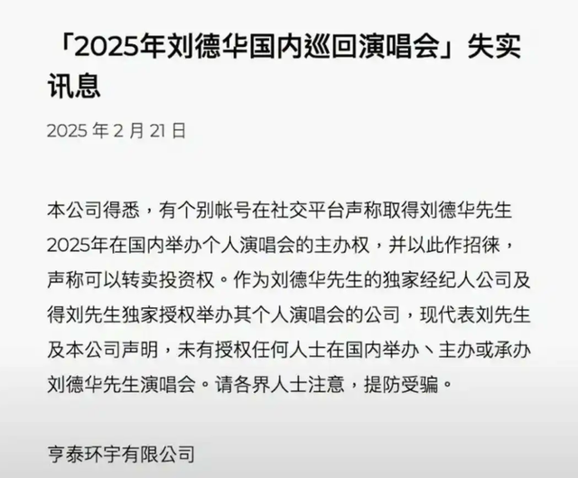 前段时间就有一些账号发动态表示,刘德华2025年将举办个人演唱会,他们甚至还想要转卖投资权,引得天王本人都亲自上场打假。